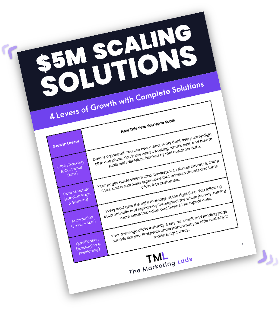 “We analysed hundreds of scaling businesses and spotted a clear trend — the journey from under $1M to $5M and beyond tends to follow the same pattern. That’s how the $5M Scaling Solutions was born. Almost every business scales by focusing on these four key growth levers. This document outlines the problems you face, how to solve them, and how these levers help you scale to and beyond $5M.